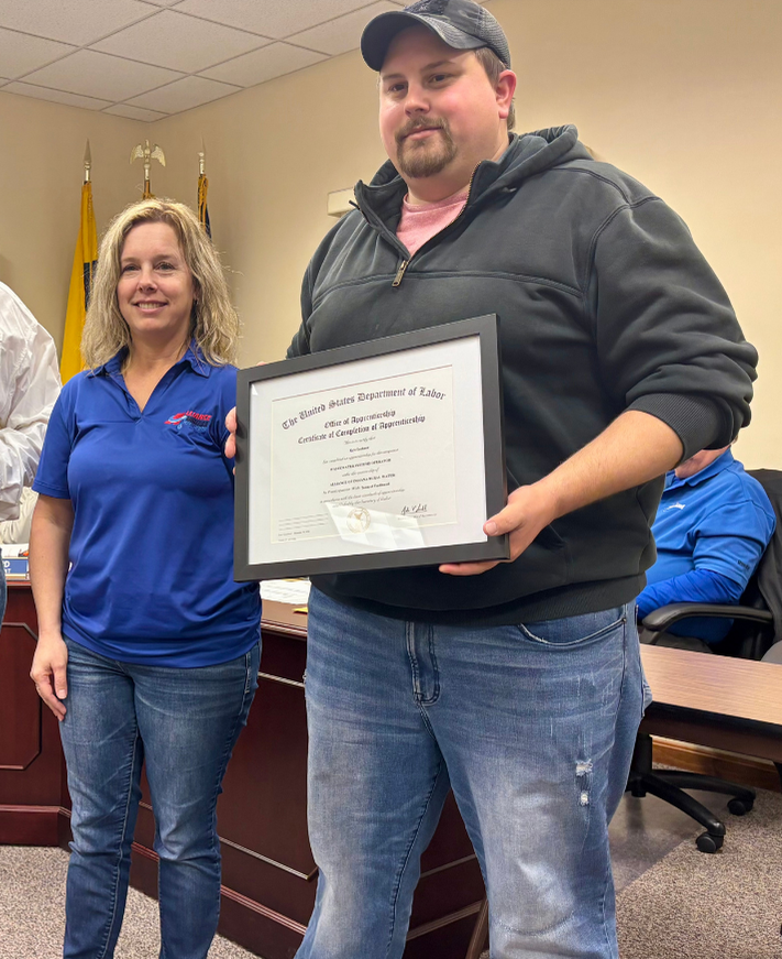 2/18/2025 - Kyle Lechner received his certificate of completion of the Alliance of Indiana Rural Water Wastewater Apprenticeship Program which included 4,000 hours of on-the-job training, 288 hours of class course (IDEM) Certification Exam for a Wastewater Treatment Class II License. Award presented by Kelly Gardner - Apprentice Program Coordinator.